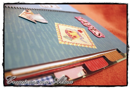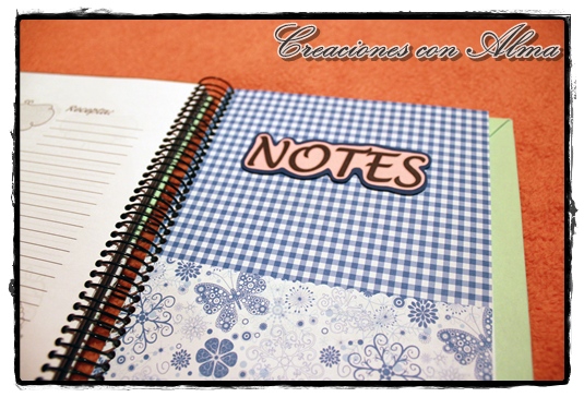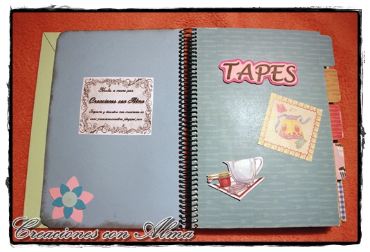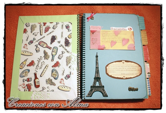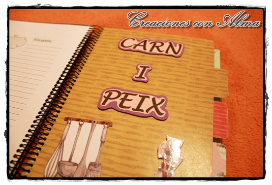 Cada uno de los apartados lleva el titulo, decoración con elementos de cocina y un bolsillo por la parte de atrás para recetas sueltas.