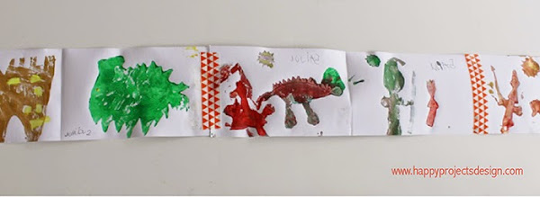 6. Unimos todas las cartulinas con washi tape formando una gran tira en acordeón con las seis escenas de nuestra historia: