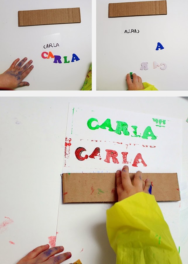 1. Escribe el nombre con un rotulador permanente en un trozo de plástico transparente. Escríbelo también con las letras de goma Eva que usarás para el sello.