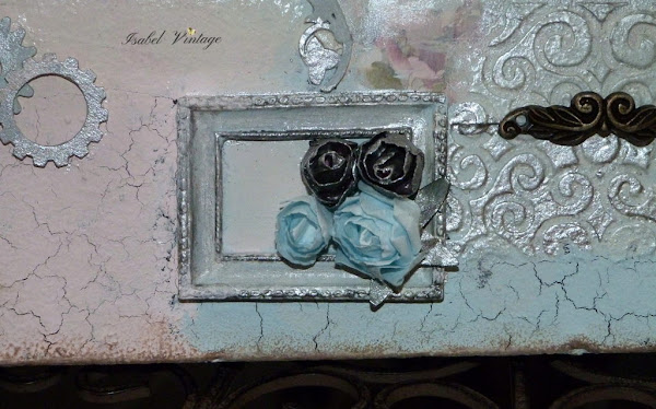 Unos estarcidos en relieve, siluetas de madera, un pequeño marco de marmolina, craquelador en la parte inferior, puntilla... iba poniendo y quitando intentando hacer una composición que me gustara.