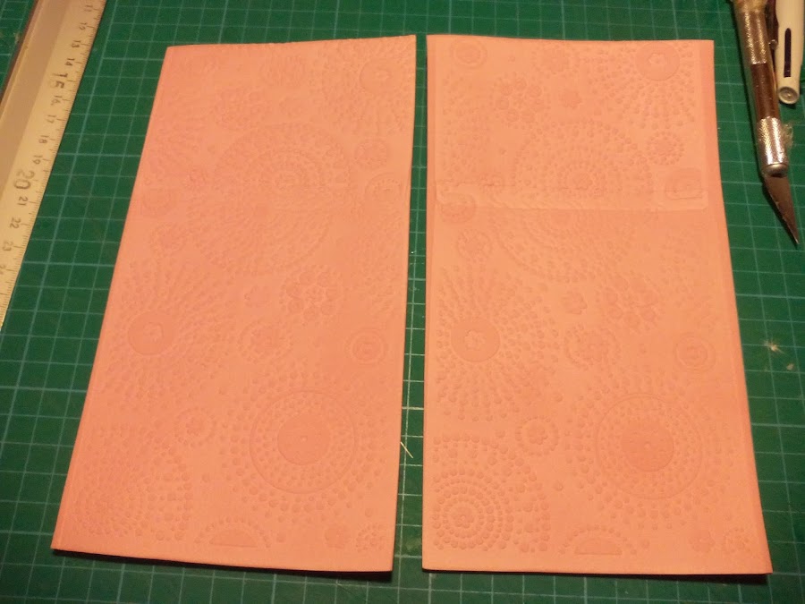 5. Cortamos dos trozos rosa de goma Eva, troquelamos con la carpeta de embossing para crear un dibujo.