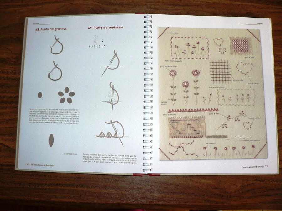 Yo imagino que el diseñador del libro quiso ponerle espiral para que pareciera un cuaderno cuando lo abres dado el título. Pero a lo mejor una espiral por fuera parecía de poca calidad. Así que por fuera una cubierta más tradicional. Pero claro, si la espiral era grande, el libro no quedaría plano, parecería un bloc de anillas vacío. Por lo que escogieron la espiral más pequeña que pudieron. Pues sabéis qué? Que la experiencia para el usuario es nefasta! En mi opinión como usuaria, deberían haber dejado una espiral más grande aunque se viera por fuera. Es lo más cómodo, podrías girar las páginas como en una libreta y sería más fácil tener el libro contigo mientras bordas.