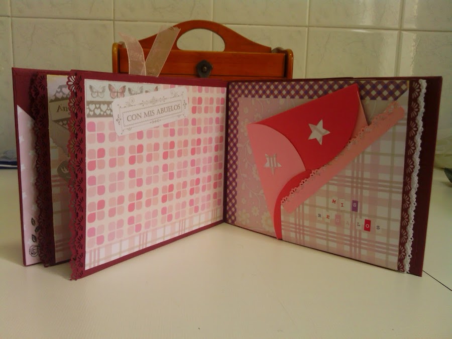 Como me gustó mucho hacer la TARJETA SOBRE que os enseñé en mi último post, he hecho una en la que he introducido un papelito para que escriban los regalos que han recibido. Esta tarjeta va dentro de un bolsillo.