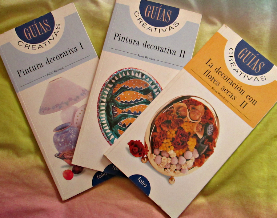 Y por último unos libros coleccionables, de los cuales obviamente no tengo todos, llamados Guias Creativas, y yo tengo dos, Pintura decorativa I y II de Juliet Bawden, donde enseñan a darle nueva vida a objetos, es muy parecido al que he mencionado antes, pero los diseños son diferentes. Y luego está Decoración con Flores secas II de Sarah Waterkeyn (no se si la primera parte está perdida, o que solo tenemos la segunda) donde te enseñan a hacer unos centros de mesa, y a decorar algunos objetos, como lámparas de pantalla, con flores secas, y son preciosos!