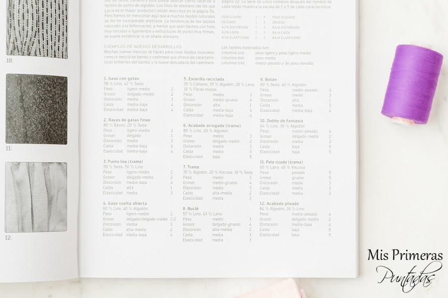 Luego hay un gran apartado de muestras de tejidos con las características de cada uno. El problema vuelve a ser el mismo, son muchos datos y muy técnicos y no creo que pueda aplicarlos en mi día a día. Además las fotografías de las muestras de tejidos son en blanco y negro (mejor dicho, todas las fotos de este libro son en blanco y negro y a veces cuesta apreciar lo que quieren mostrar).