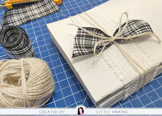 En uno de los laterales de los lomos vamos a estampar palabras o frases y al otro lado vamos a atarlos usando arpillera blanca, cuerda de yute y un tozo de cinta de cuadros vichy en negro.