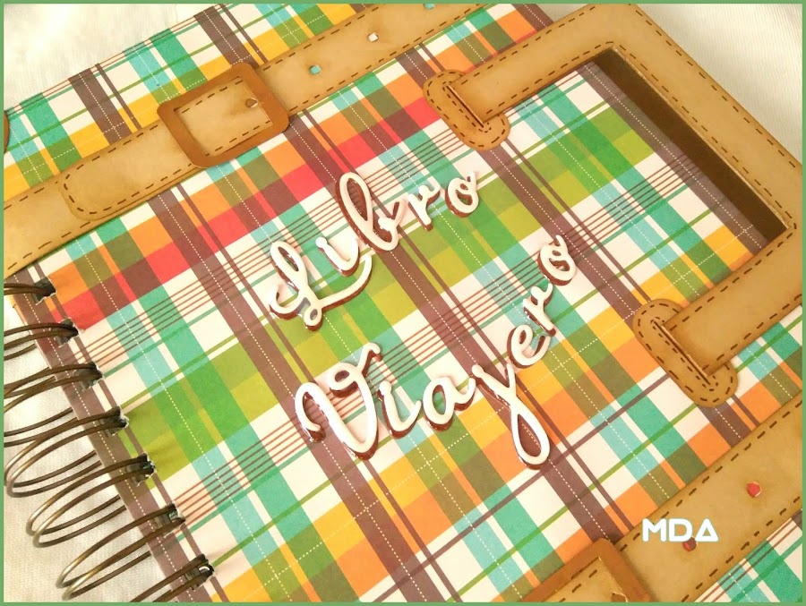 Papel de cuadros de una colección de Pebbles, y letras troqueladas de un alfabeto de La pareja creativa en cursiva. La encuadernación con una espiral en oro antiguo y mi Cinch (cada día la domino más...jejejeje)
