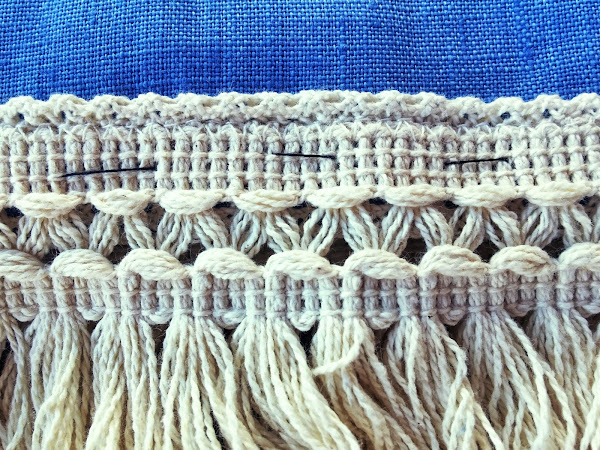 Ahora la adornaremos a nuestro gusto, yo en este caso he elegido flecos. Los he colocado al final del dobladillo, todo alrededor, y en el cuello, a modo de collar. También he utilizado una cinta de crochet para rematar el escote. Primero lo cosí a mano y luego aseguré a máquina.