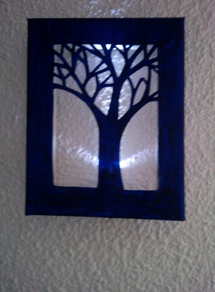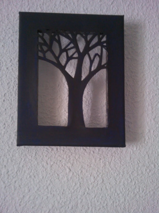 Ponemos una argolla para colgar el cuadro y ya si queremos darle un toque especial podemos poner por el interior una linterna pequeña como he hecho yo en este caso o unas luces led, según el tamaño de nuestro cuadro y donde lo queramos colgar.