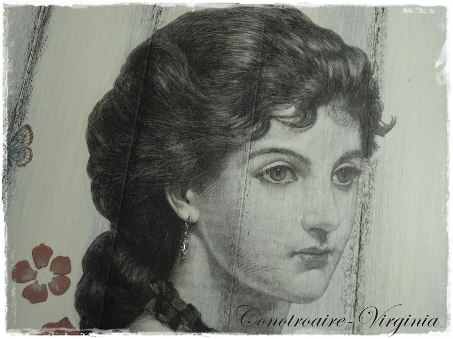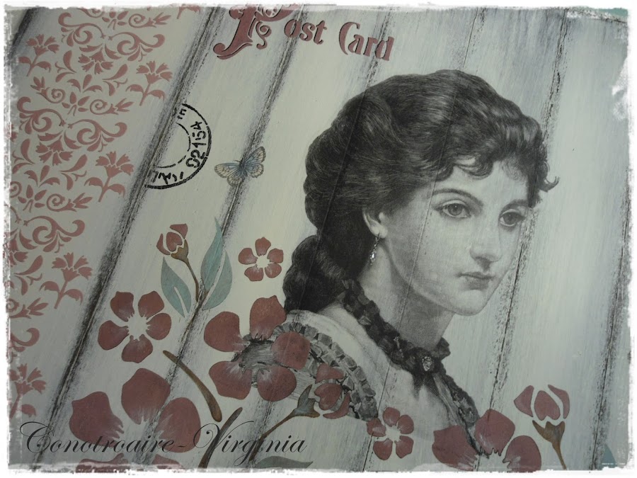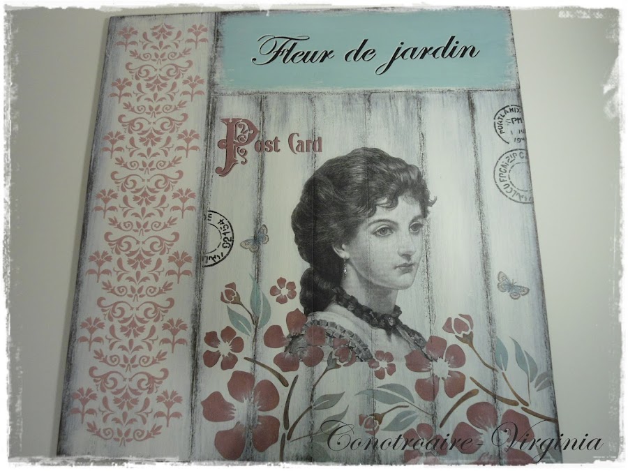 Para la decoración he usado las pinturas Chak Paint de Fleur, los colores Chalk White, Cape Town Blue y Elengant Rose, y a excepción de la imagen de la mujer y las mariposas, lo demás esta todo hecho con stencil.
