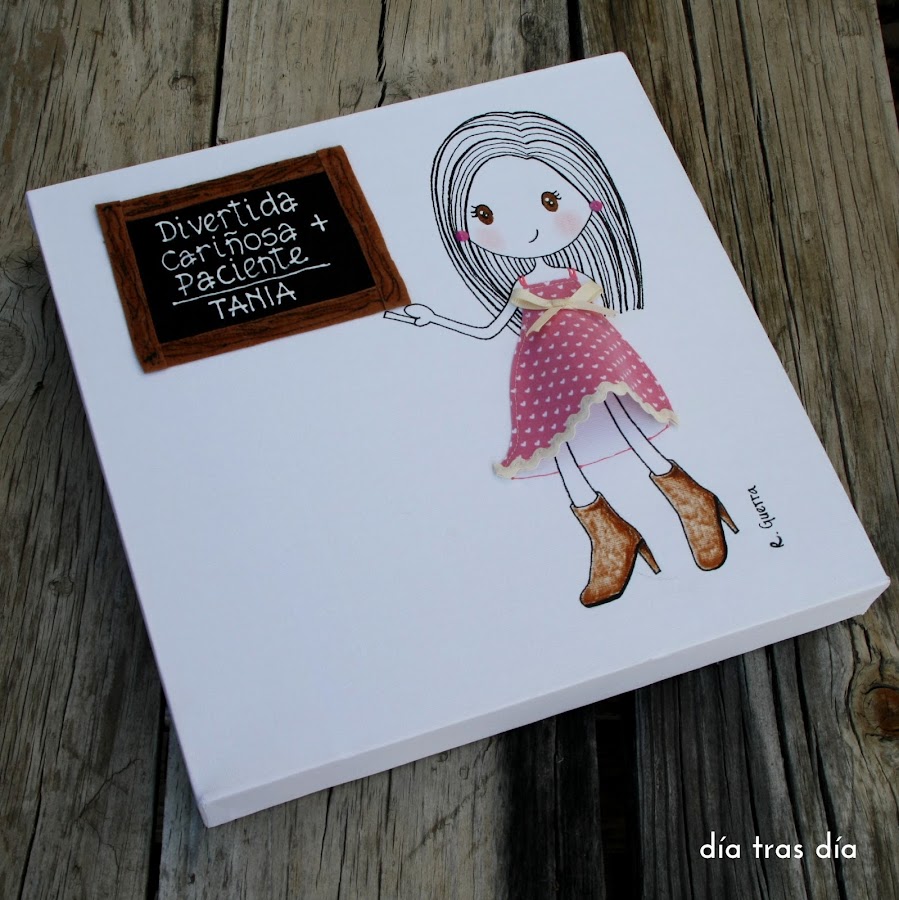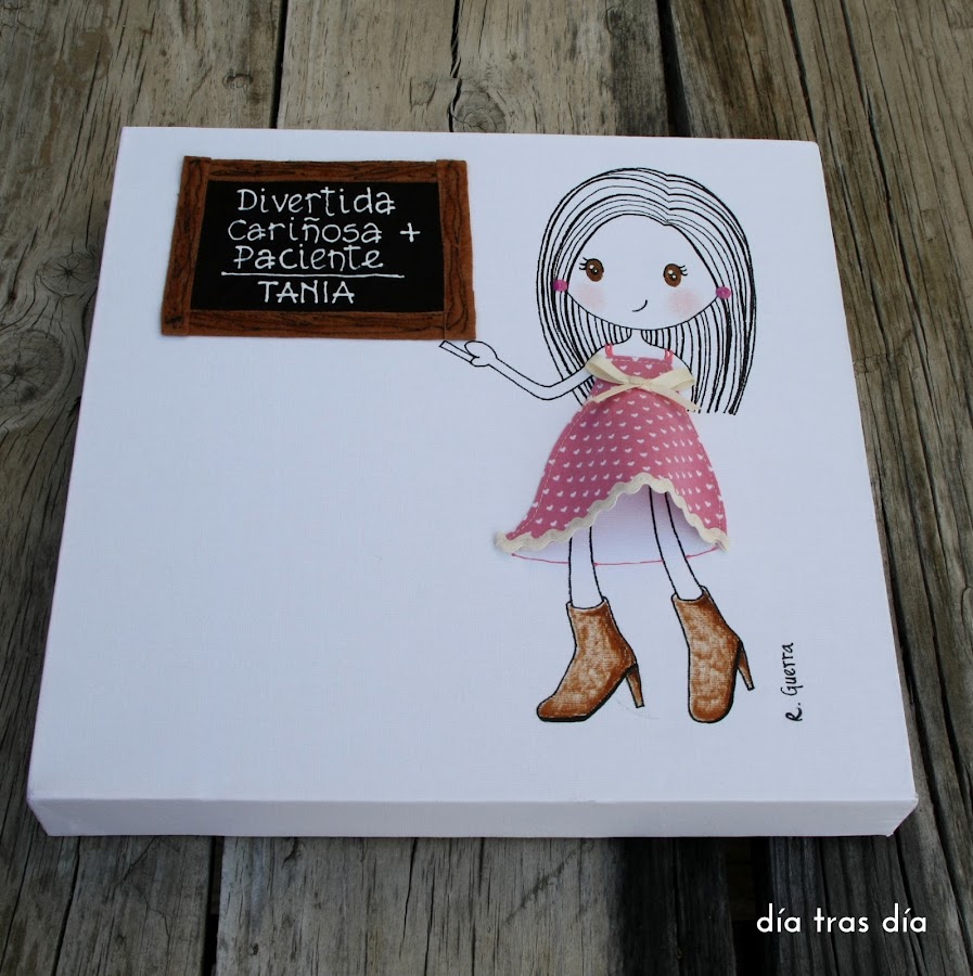 Si el jueves pasado os enseñaba un lienzo para regalar a una niña que hizo su Primera Comunión, hoy os traigo un detallito, también sobre lienzo, que me pidió Dori para regalar a una maestra de primaria.