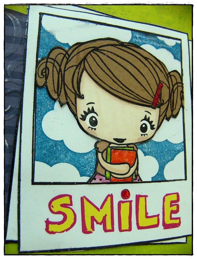 La niña es un sello de Greeting Farm, y se llama Anikka, con fondo de nubes Hero Arts Clous, dentro de un sello polaroid, de Lawn Fawn que se llama Say Cheese.