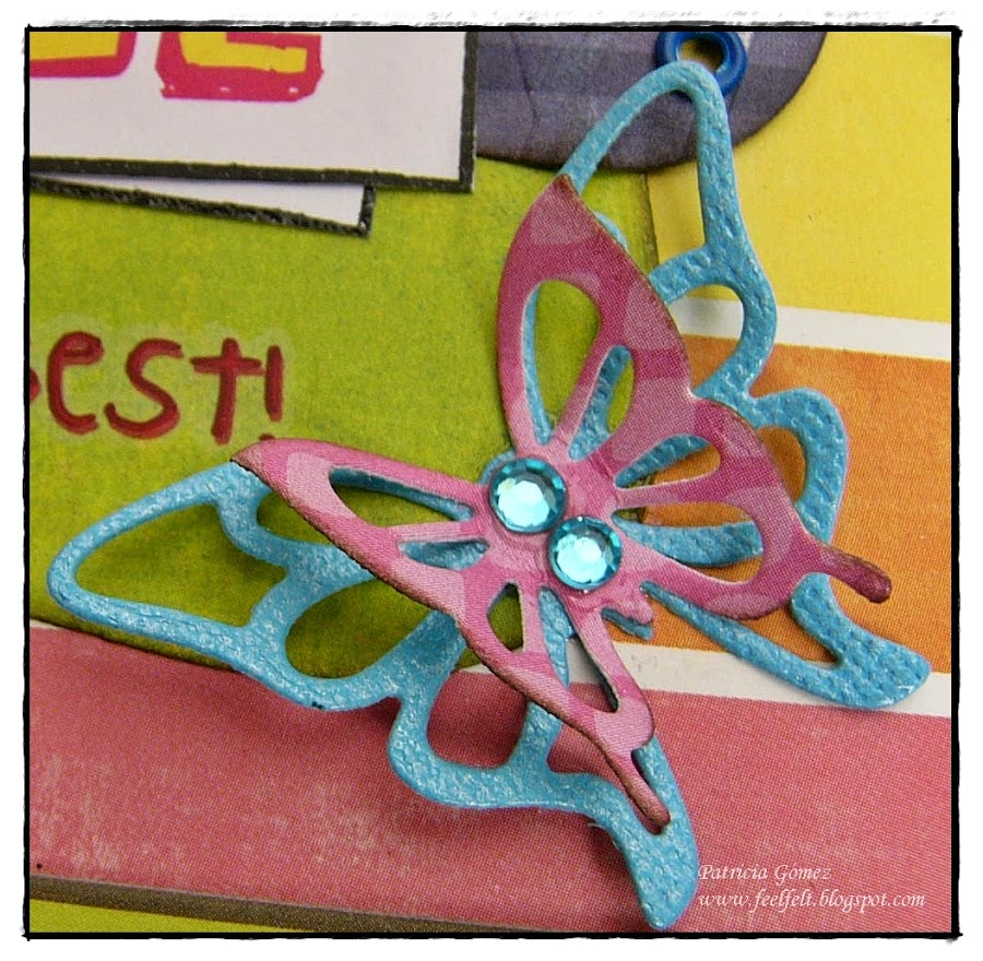 El troquelado amarillo que lleva en la parte de arriba y abajo está hecho con la troqueladora de bordes EK Crochet Lace y EK Crochet Lace