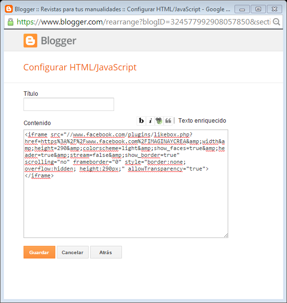 AGREGAREMOS UN GADGET EN HTML Y PEGAMOS AHI EL CODIGO ANTERIOR.