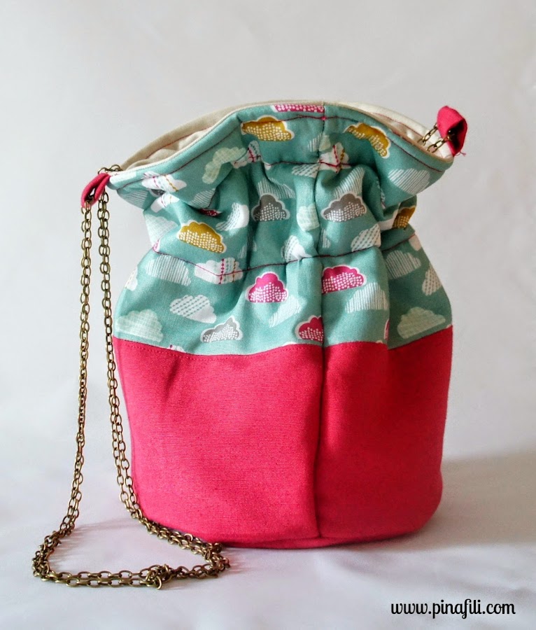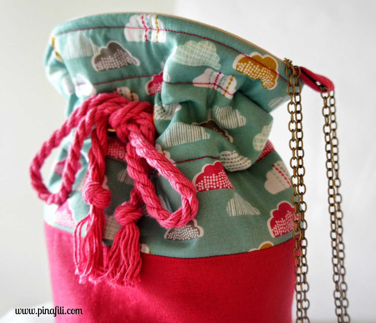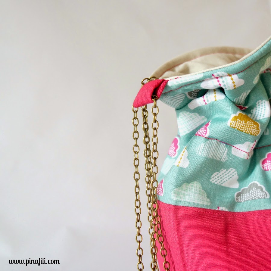 Para ajustarla, sólo tenemos que fruncir e cordón frambuesa y para poder llevarla colgada tiene una cadena de un metro de longitud aproximadamente.