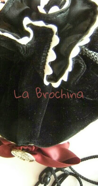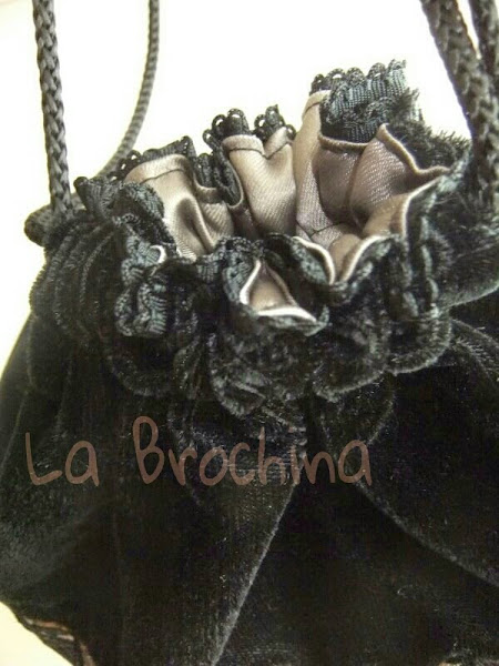 De terciopelo negro combinado con tela tipo tapiceria, encaje tipo bolillo, lazo granate de satén, borla gris a tono y un cordón también de saten.