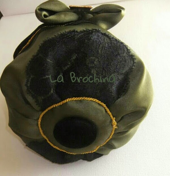 Esta limosnera también en terciopelo negro, esta combinado con satén verde, lleva aplicaciones de encaje negro, con detalles en dorado.