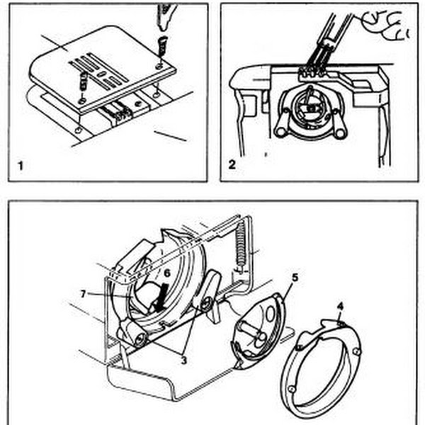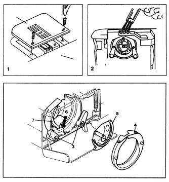 Retire la cápsula de la canilla. Lleve hacia fuera los dos brazos de retención del garfio (3). Retire la cubierta de la zona de recorrido del garfio (4) y el propio garfio (5) y limpie con un paño suave. Aceite la punta (6) con 1 o 2 gotas de aceite para máquinas de coser. Gire el volante hasta que la zona de recorrido del garfio (7) esté en la posición de la izquierda. Vuelva a colocar el garfio (5), vuelva a colocar la cubierta de la zona de recorrido del garfio, inserte cápsula de la canilla y la propia canilla y vuelva a colocar la placa de agujas.