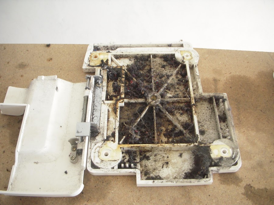 En la foto podemos ver la cantidad de pelusilla y restos de telas que quedan en el interior de la tapa inferior, la limpiaremos totalmente.
