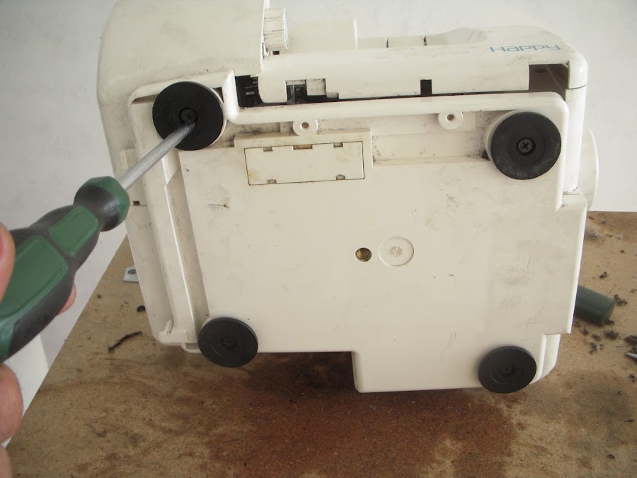 Sacando los tornillos frontales, tal como muestro con el destornillador podemos acceder a los mecanismos internos desde la parte frontal, y limpiarlos. Es muy importante limpiar las remalladoras ya que suelen coger mucha pelusilla y restos de tela, debido al corte de la cuchilla.