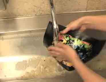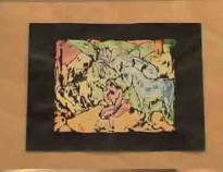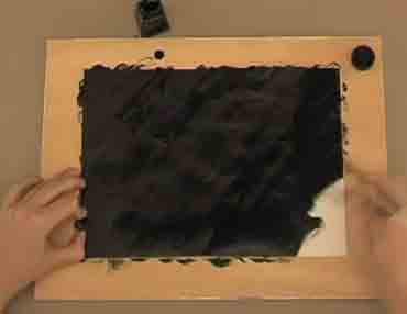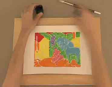 Una vez seca colocaremos el trabajo bajo el agua de una canilla y limpiaremos la tinta china, solo quedara con tinta las zonas que habían quedado descubiertas o semidescubiertas por los colores.