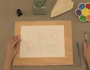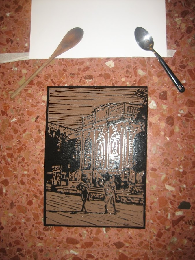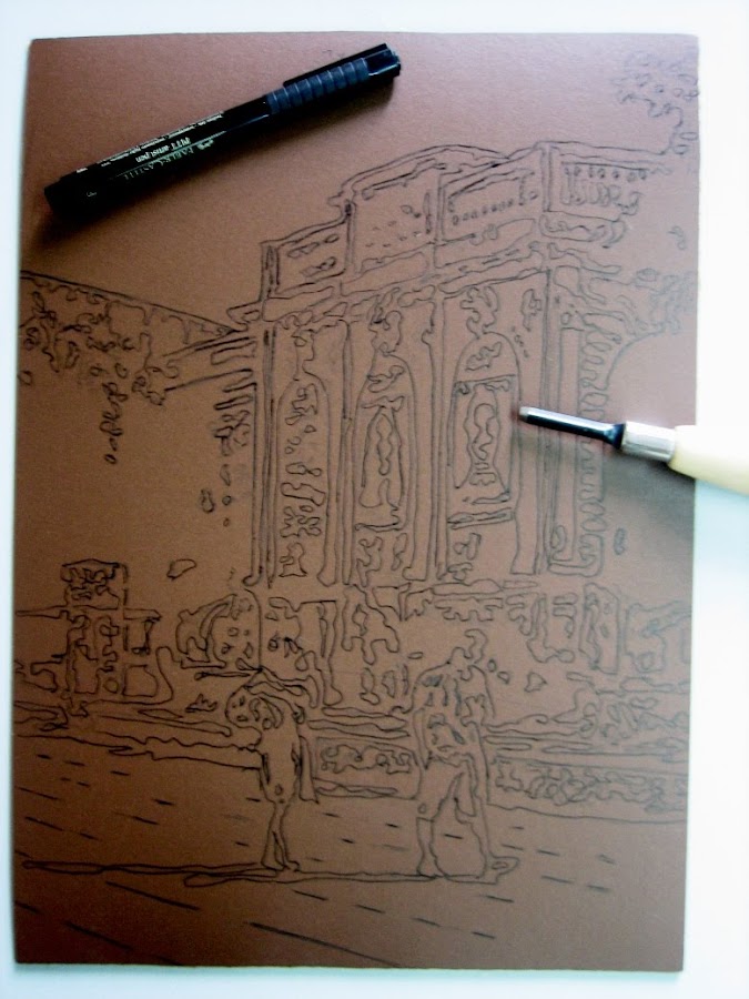 Con la técnica de falso linograbado intentaremos simular la técnica original. El proceso es simple, se parte de un dibujo al que le aplicaremos acuarelas de colores (puede ser acrilico o tempera) colores con el cuidado de dejar las lineas del lápiz descubiertas o semidescubiertas.