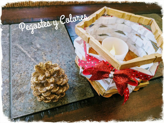 3.- Le sujete un liston que es del mismo ancho de las pinzas, y lo sujete con un pequeño mono rojo brillante. Ya nada mas le ponemos una vela enmedio.