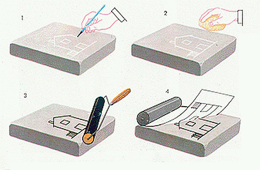 1) Se traza el dibujo con el buril o el lápiz litográfico sobre la piedra litográfica.