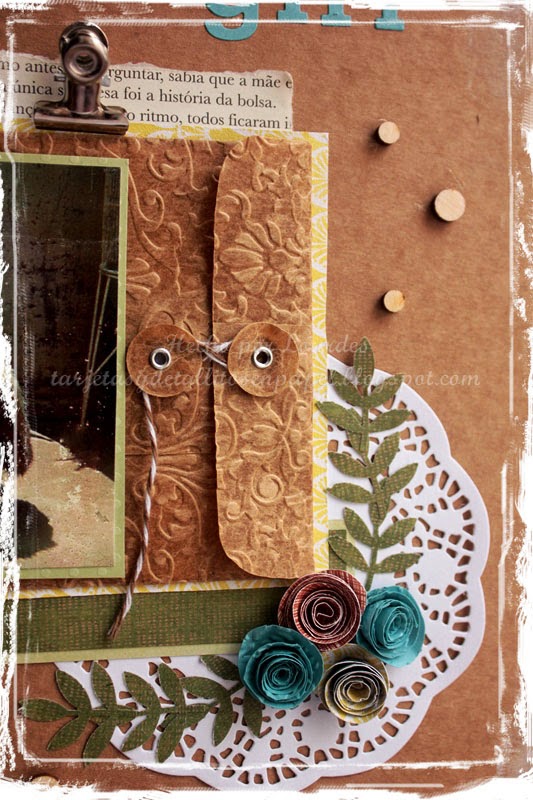 fondo kraft, blonda (estampada y troquelada), rub-on de pajarito, páginas de libros, un clip metálico y ramas. Además de introducir el journaling dentro de un sobre de kraft glassine.