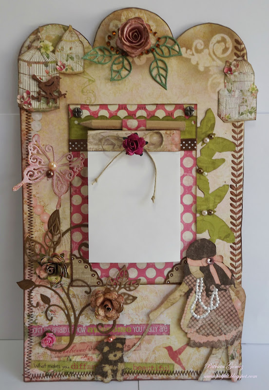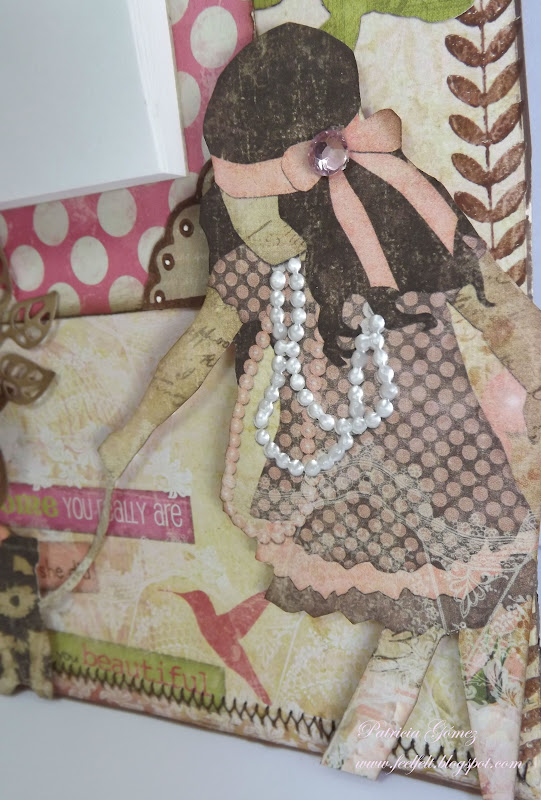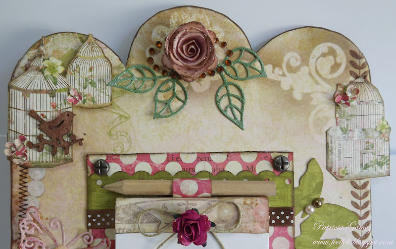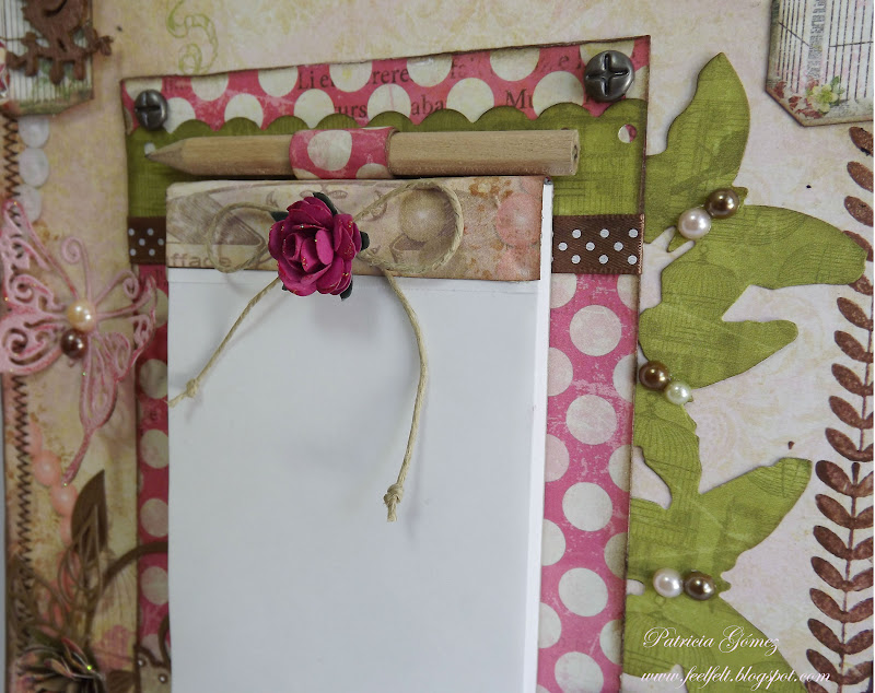 Las pequeñas flores están hechas con la troqueladora de Martha Stewart 3 in 1 Hydrangea Punch, con toque de liquid pearl en el centro. El pajarillo es un troquelado de madera, teñido con glimmer mist y embosado con polvos transparentes de alto brillo (aunque no se aprecie mucho :S)