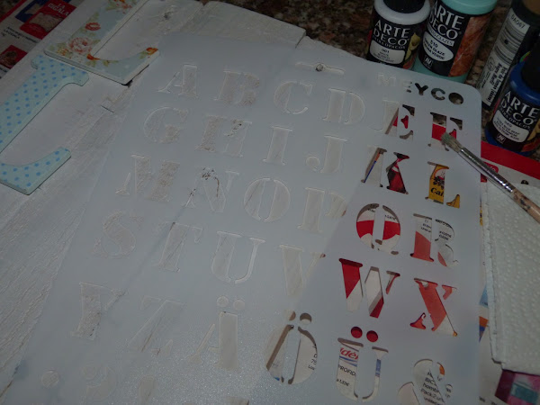 Plantilla de abecedario, pincel de punta recta para estarcir y pinturas acrílicas.