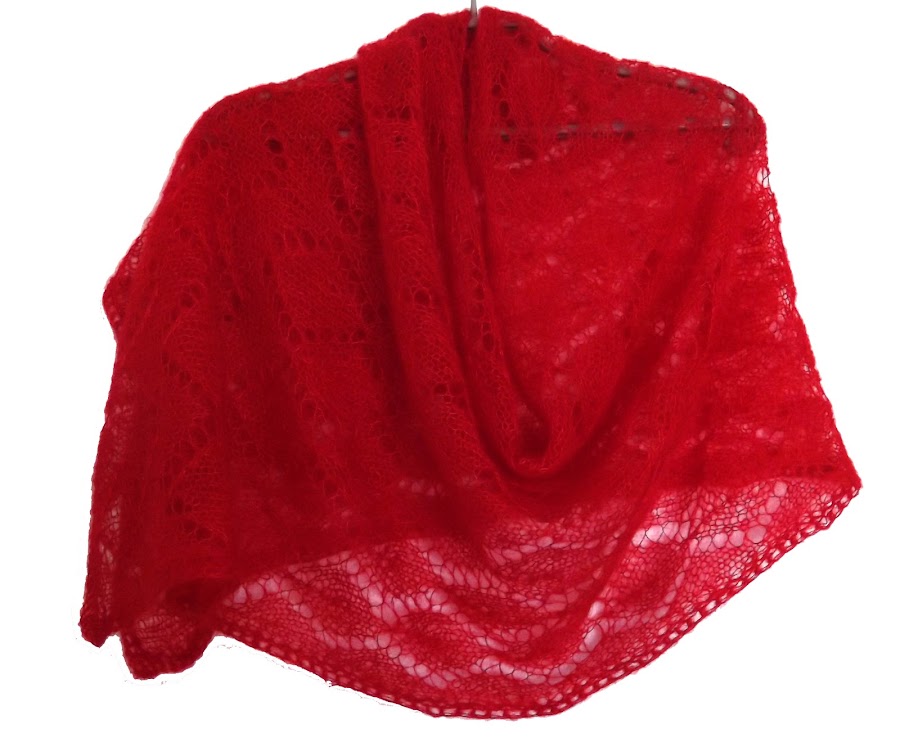 Para este chal rectangular de tamaño aprox. 44*166 cms. he usado poco más de 2 ovillos (444.5 mt) de Mohair seda, agujas circulares de 5.5 mm.y ganchillo del nº 4.