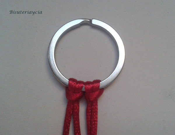 Para empezar cortad dos hilos de unos 20 cm y atarlos a la anilla con el nudo alondra.
