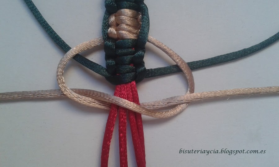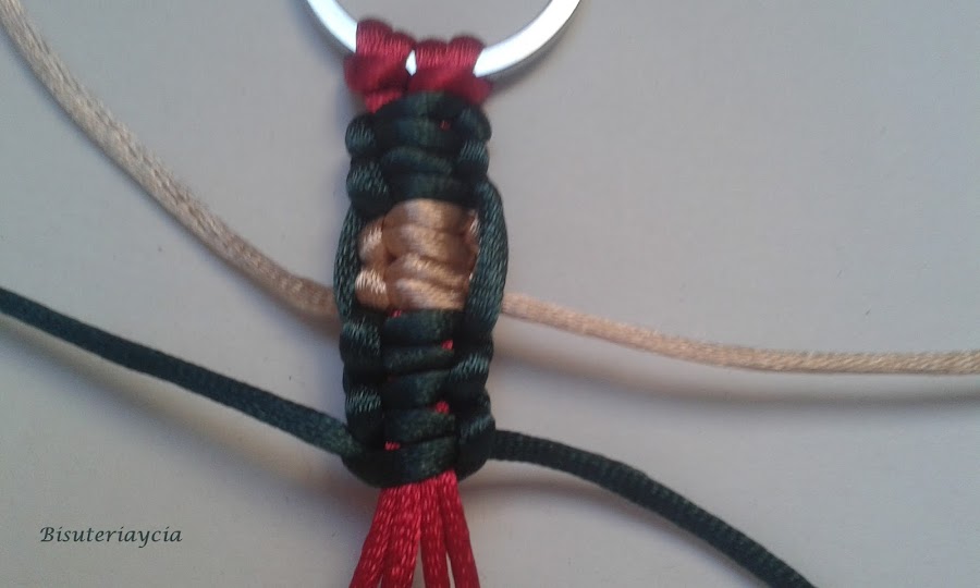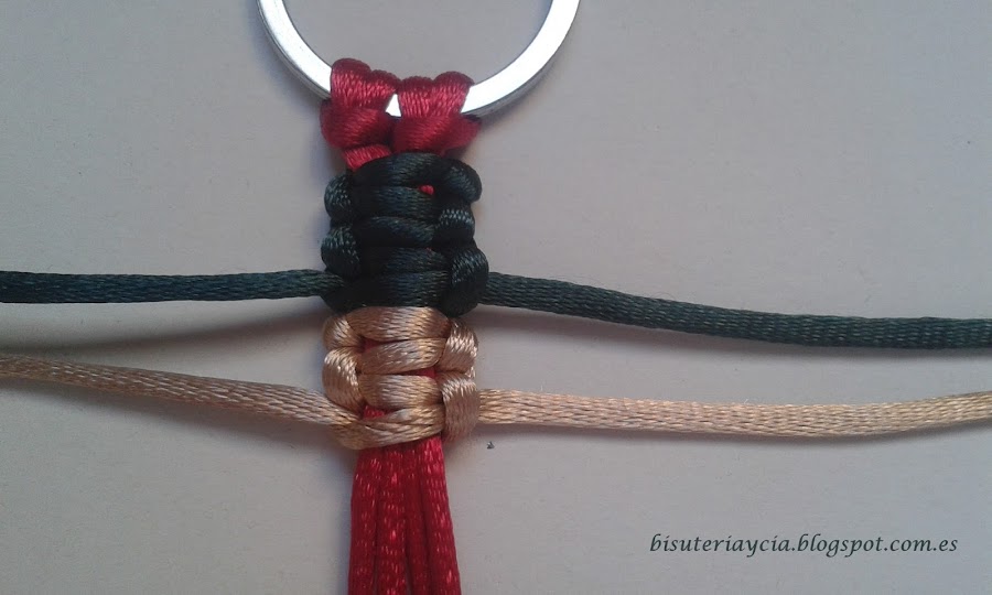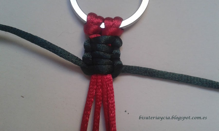 A continuación cortad unos 30 cm de hilo de otro color, y hacéis 6 nudos planos macrame, tres por lado.