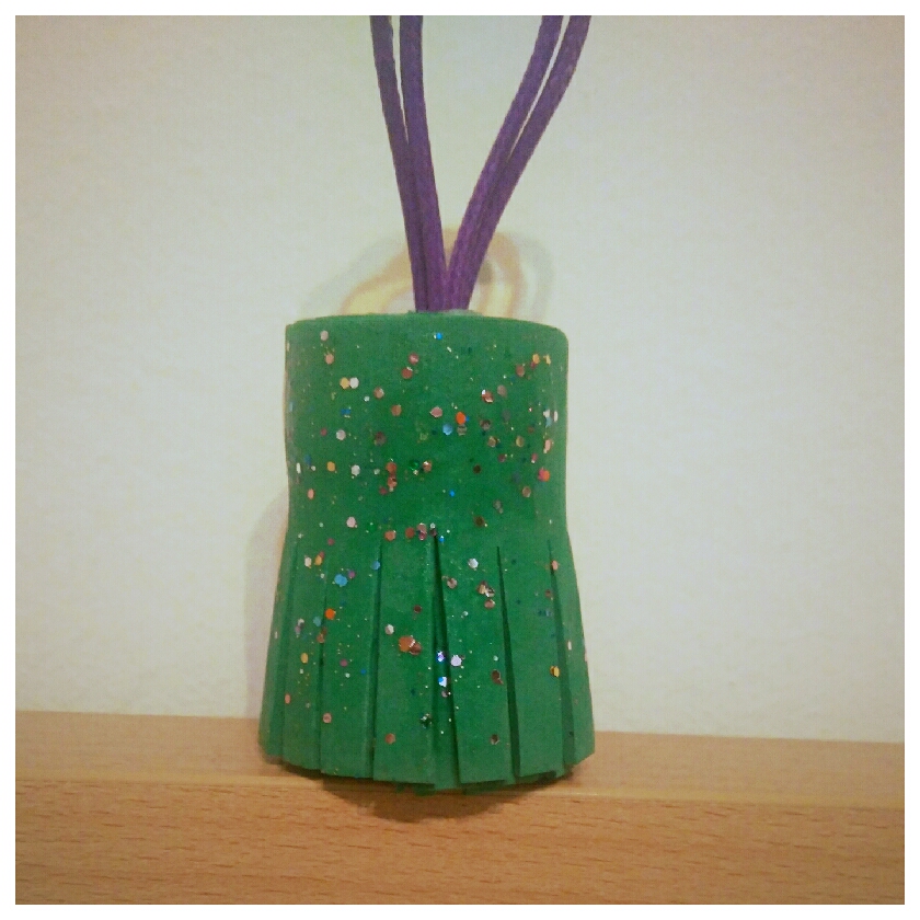 Sólo tienes que cortar una tira de goma eva de unos 40 cm d largo y unos 8 de ancho. Haz pequeños cortes en toda la goma eva sin llegar a cortar del todo. Una vez cortado, pon la cuerda deseada y ve enrollando y pegando con silicona.