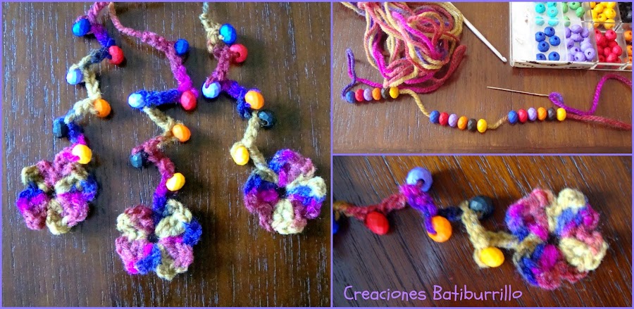 Son una combinación de ganchillo en lana multicolor otoñal, cintas y abalorios.
