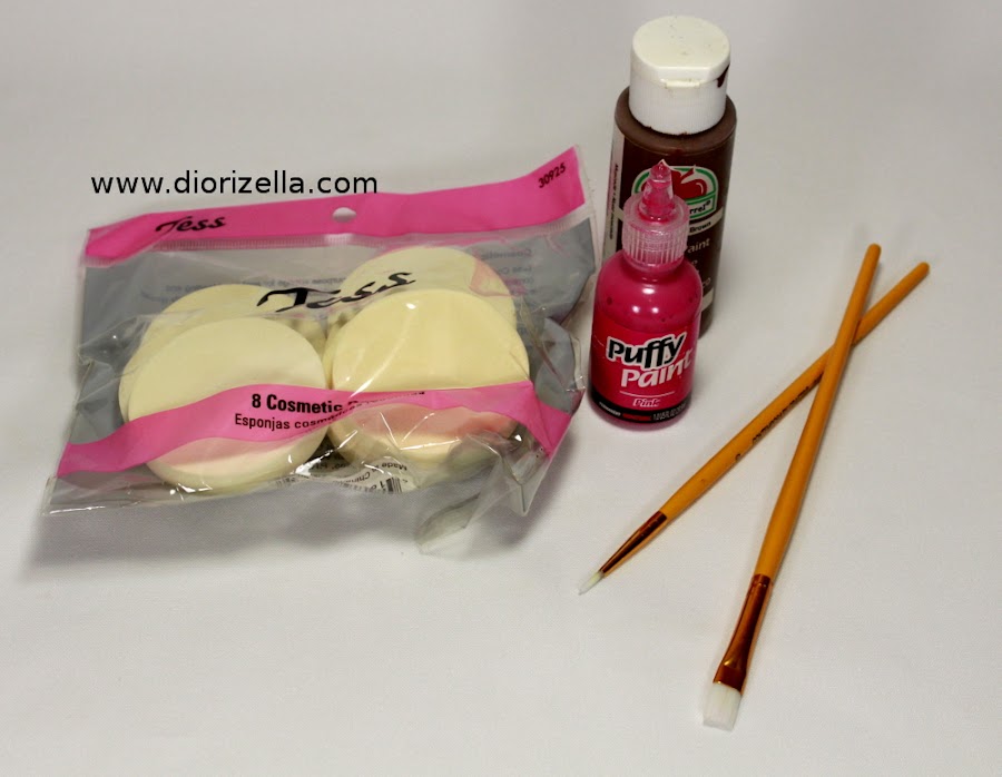 Los materiales que use fueron: esponjas para maquillaje, pintura acrílica, pintura puffy, pinceles, pegamento escolar blanco, pegamento E6000 y una argolla con cadena para el llavero.