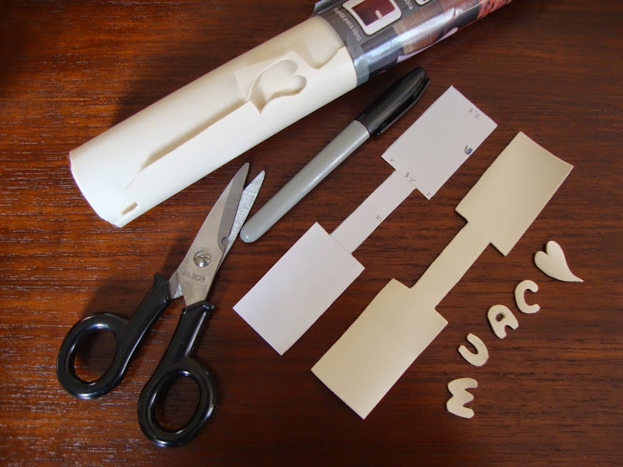 Hacemos lo mismo con las letras del mensaje ( muac, love, te quiero, ...) y dibujos, o los pintamos directamente sobre el revés de la polipiel para después recortarlos.