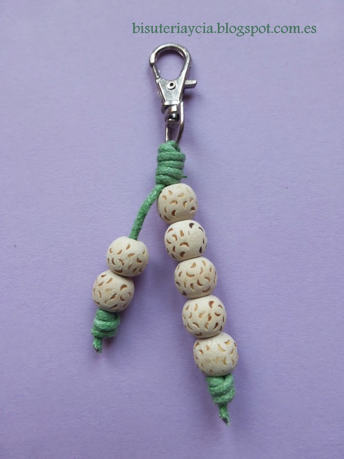 Este modelo esta hecho de cordón encerado y bolitas de madera.