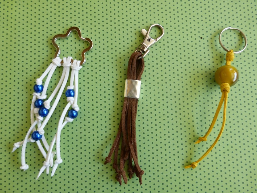Cortaremos unas tiras de antelina las pasaremos por la anilla del llavero, colocaremos la pieza de Zamak a la altura deseada y remataremos los extremos de los hilos con unos nudos simples.