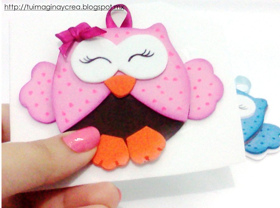 Para terminar pegamos el búho terminado sobre un trozo de foami y recortamos dejando un ligero borde, esto para dejarlo mas resistente.