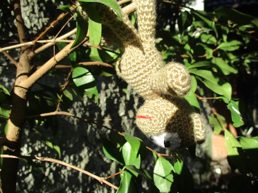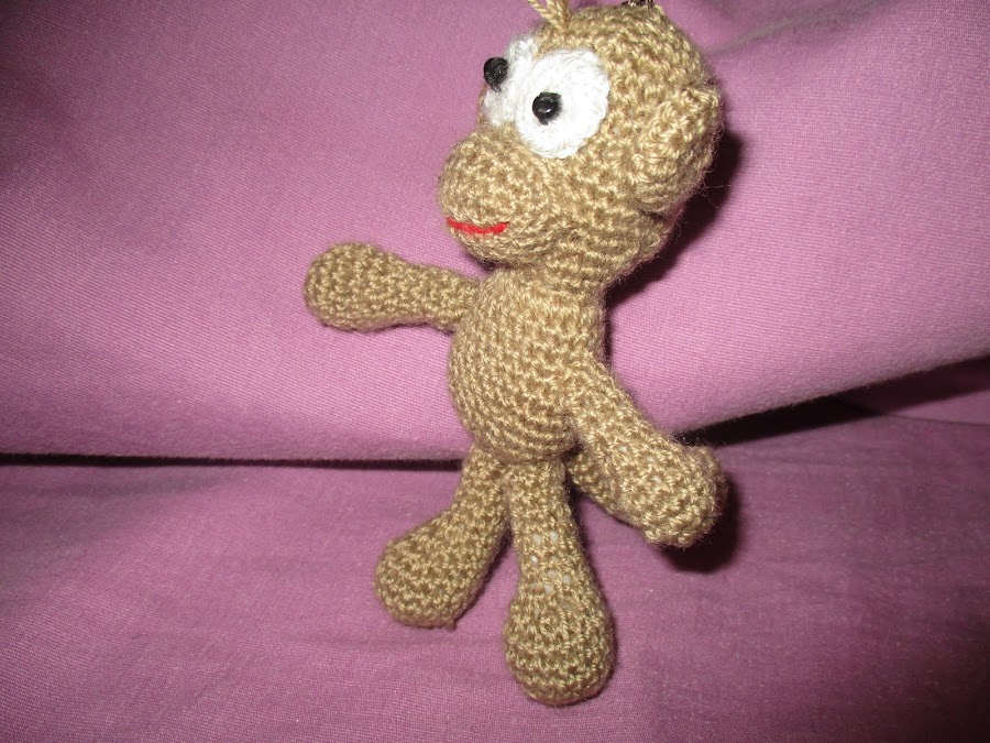PARA EL LLAVERO MONITO UTILISE LANA CASMILON DE VERANO EN COLOR MARRON Y PARA LOS OJOS EN BLANCO, LO TEJI CON AGUJA 2.5, PARA EL CENTRO DE LOS OJITOS LE COLOQUE UN ABALORIO COLOR NEGRO Y LE PUSE UNA CADENA CON ARGOLLA PARA LAS LLAVES.