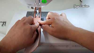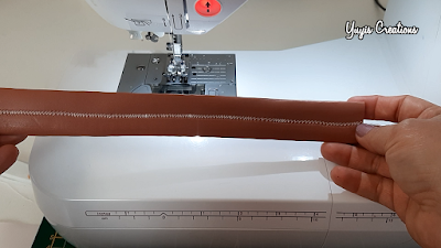 Vamos a coser por el centro con una puntada en zigzag. Yo por mi parte voy a usar la misma puntada quebrada. A medida que voy cosiendo, voy doblando la polipiel porque a este material no se le puede colocar alfileres porque se daña.