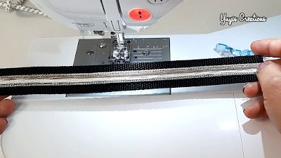 A la cinta para mochila le vamos a coser, centrada, la cinta que hayamos elegido. En mi caso le voy a coser una cinta aterciopelada con detalles en dorado que le va muy bien al negro.