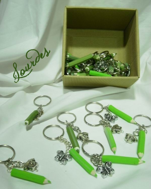 Los lápices de estos llaveros están realizados en arcilla polimérica de diferentes tonos verdes.