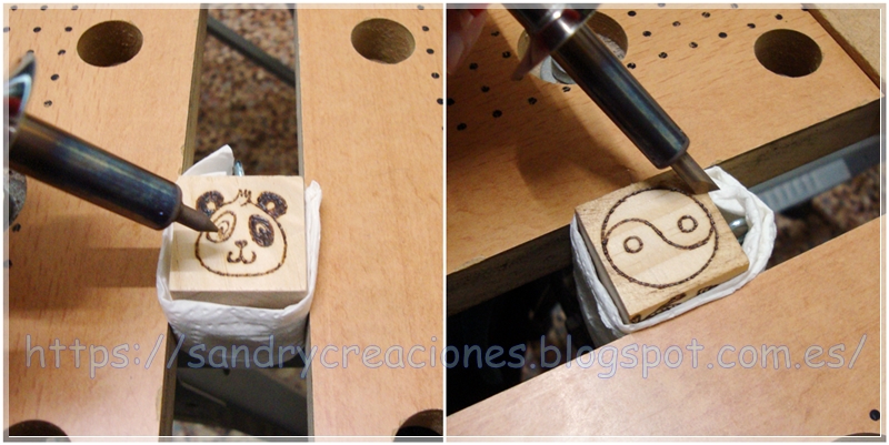 Paso 5 - Sombrear las zonas oscuras de los dibujos con el pirograbador. Con las diferentes puntas del pirograbador iremos sombreando las zonas que queramos que sean oscuras de cada dibujo.