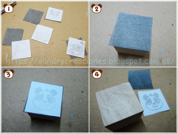 Paso 3 - Pasar cada dibujo al cubo de madera mediante el papel carbón o de calco. Una vez realizados los dibujos y el diseño del llavero, cortamos cada dibujo a la medida de la cara del cubo y luego cortamos un trocito de papel de calco de la misma medida (imagen 1), ponemos el papel de calco encima de la madera con la cara que deja el carbón tocando la madera (imagen 2), ponemos el dibujo encima y con un lápiz reseguimos todo el contorno del dibujo procurando que no se nos mueva ni el dibujo ni el papel de calco mientras lo hacemos (imagen 3 y 4).