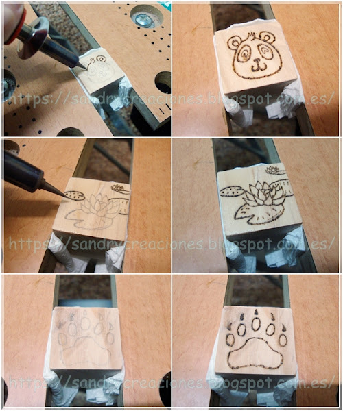Paso 4 - Pirograbar cada dibujo con la ayuda de un pirograbador. Reseguimos el contorno de cada dibujo con el pirograbador con una punta fina. Al ser una superficie tan pequeña hay que ir con cuidado al reseguir y sobretodo intentando no quemarnos .