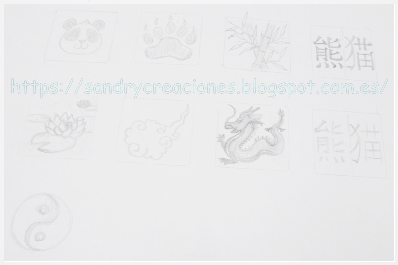 Paso 1 - Dibujar o elegir los iconos orientales que irán a cada cara del cubo. Nosotros preferimos dibujarlos nosotros e hicimos varios cuadrados en un papel de la medida de las caras del cubo y dibujamos en él los dibujos de las cuatro caras de cada cubo de madera. Hicimos dos de diferentes, uno con la temática "Oso Panda" con la cara de un Panda, dos cañas de bambú, una huella de oso y los caracteres chinos que significan "Oso Panda". Y el otro más variado con una flor de loto, un dragón, el símbolo del Yin y el Yang y una nube de estilo oriental. En la imagen siguiente podéis ver nuestros dibujos hechos en papel: