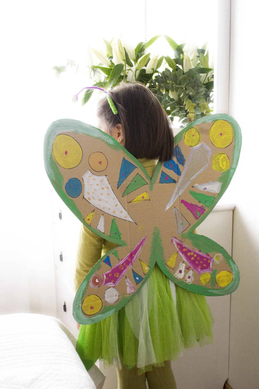 Reciclar siempre es un acierto... y construir un disfraz de mariposa y otro de mosquito es bien fácil con unas buenas alas de cartón, y algún complemento. Una tarde de manualidades, y ellos felices de haber echo su disfraz ;)